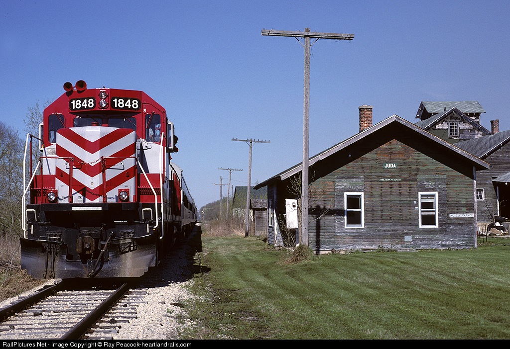 | WSOR 1848 working one end of a passenger train as part of the Green Co. RR days events, seen here passing the old Juda depot away from me. 1848 was the WSOR Wisconsin sesquicentennial painted & numbered locomotive until 2003, when it reverted back to the regular WSOR scheme and took it's slot on the power card as #2051. |