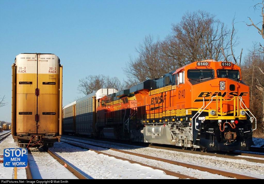Q21607, has just finished putting his train back together, after making his pick of 34 auto racks, at TDSI, with month old ES44AC BNSF 6140, & 5602, as the crew pumps up the air on a cold February day, as TDSI personal inspect Q24507's pick up in track 2.