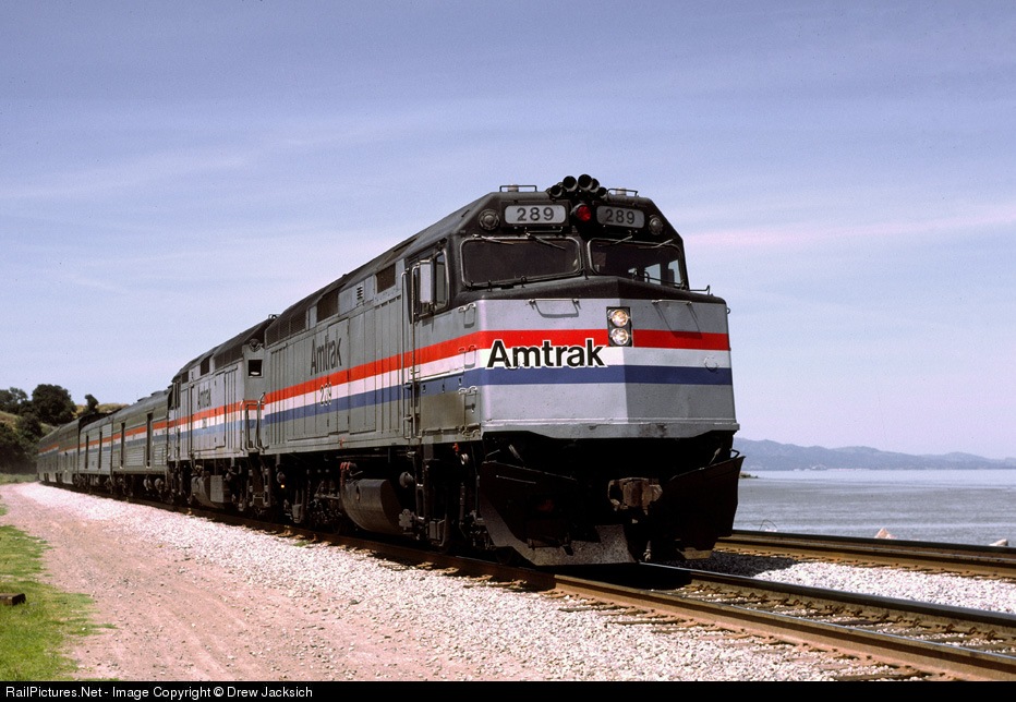 Amtrak #6, the Eastbound California Zephyr approaching Pinole as it runs along San Pablo Bay. The #289 was, at one time, equipped with SP style icicle breakers but, by 1987, they had been removed.