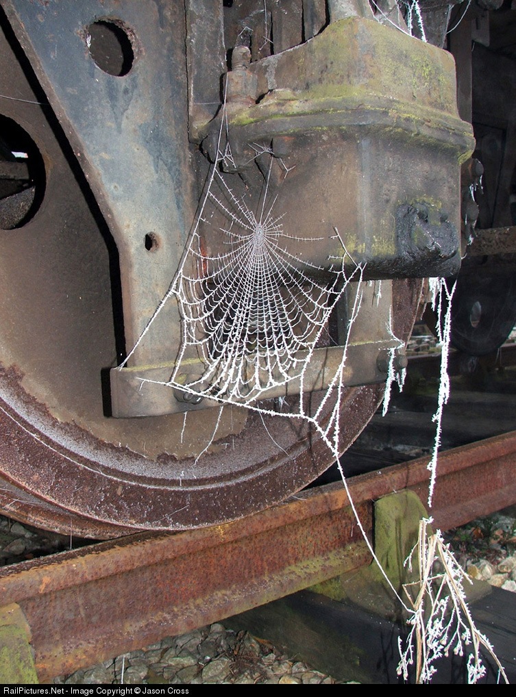 On a bitterly cold day, a hoar frost coated spider's web clings to a freight wagon in the shed yard at Blythe Bridge, Foxfield Railway, UK.