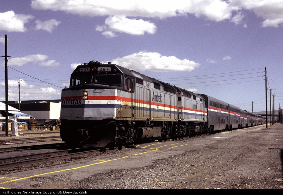 | AMTK 297 is approaching the Reno Depot after leaving the SP yards in Sparks. The train is on the present location of the Reno trench, built to bypass numerous crossings in downtown. |