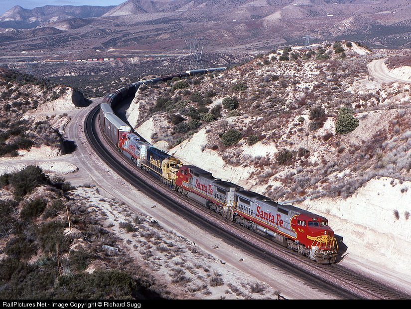An SD40-2 spoils the otherwise all red & silver consist leading an eastbound Santa Fe manifest at the big curve approaching Summit. A UP freight can be seen decending the pass in the distance.