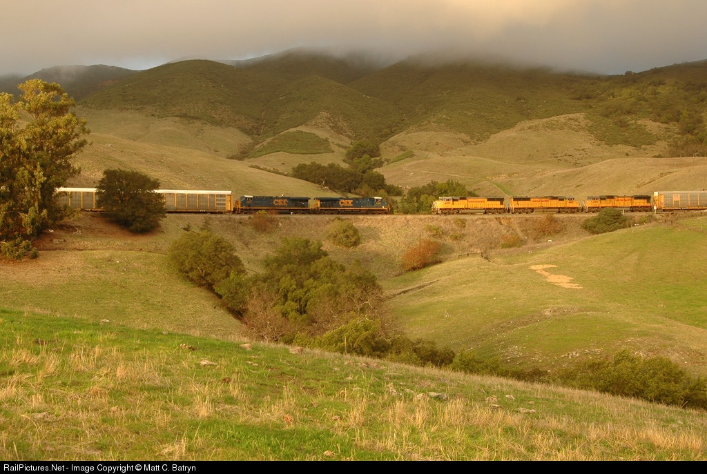 A north bound autos train (AMLMI) pulled by two CSX GEVOs meets a southbound autos train (AOAWF) at South Serrano on Cuesta Grade. Nikon D70, 28-70mm.