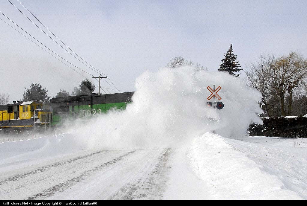 MMA 5023 South is plowing it's way through deep snow & snow drifts at a level crossing