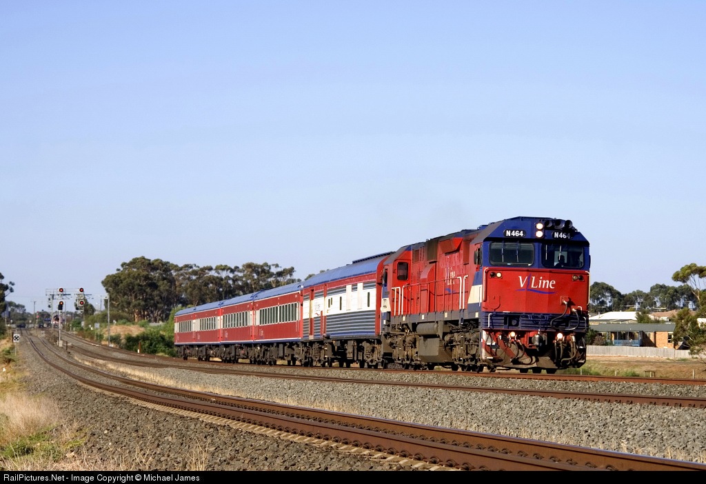 | After making a brief Station Stop at Lara, N 464 leads an N Set with Power Car toward Marshall during the afternoon peak. Whilst N Class Locomotives have Head End Power (HEP), this service is often worked by an A Class which doesn't have HEP. |
