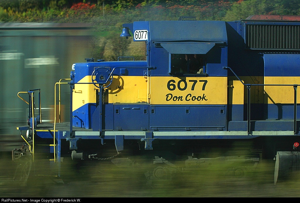 DME 6077, the Don Cook, blasts through a ravine at the west end of Frontenac Siding.