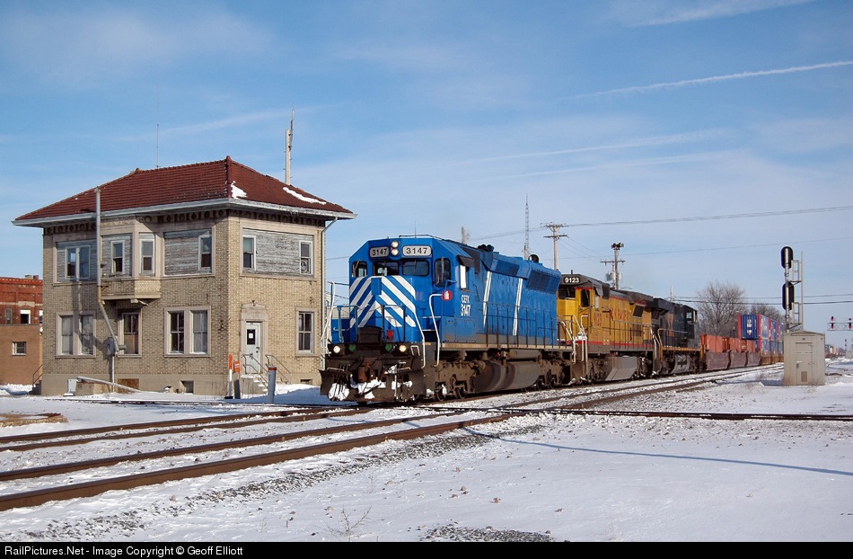 | CEFX 3147, with it's SD45 carbody, looks fresh as it leads a mixed freight westbound past the tower in Deshler, Ohio. |