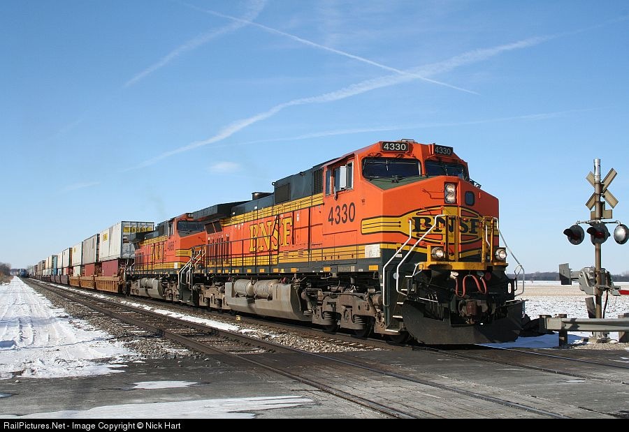 | BNSF 4330 slowly heads east down Main 1, due to an eastbound stack train being dead on hours, which is visible in the background. |