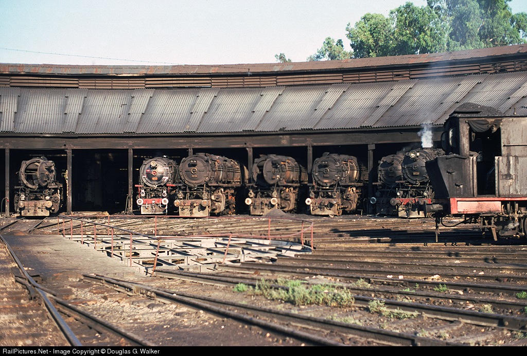 | A variety of steam locomotives fill the Türkiye Cumhuriyeti Devlet Demiryollarý roundhouse in Adama, Türkiye, in September 1972.