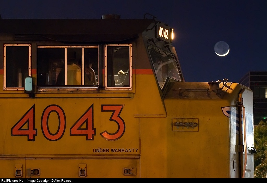 The engineer of UP 4043 east looks over his paperwork for his trip out of the Bay Area before a crescent moon sets behind some buildings. After letting all the amtraks through, the dispatcher gave him the green and not long after that he was charging through Berkeley at track speed.