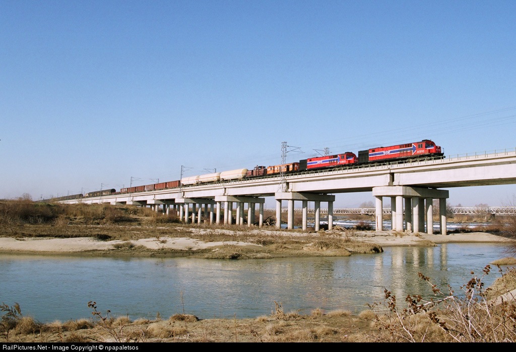 Two working locos and another two idle for this 40car freight crossing the new Axios bridge on the way to Thessaloniki