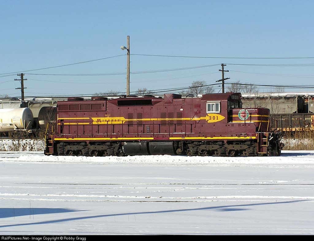 Very nice looking DM&IR SD-M 301, in almost perfect condition paint, makes a rare appearance on IC territory at Homewood. 301 is one of 5 remaining SD-Ms operating and it recently has received a yellow frame stripe.