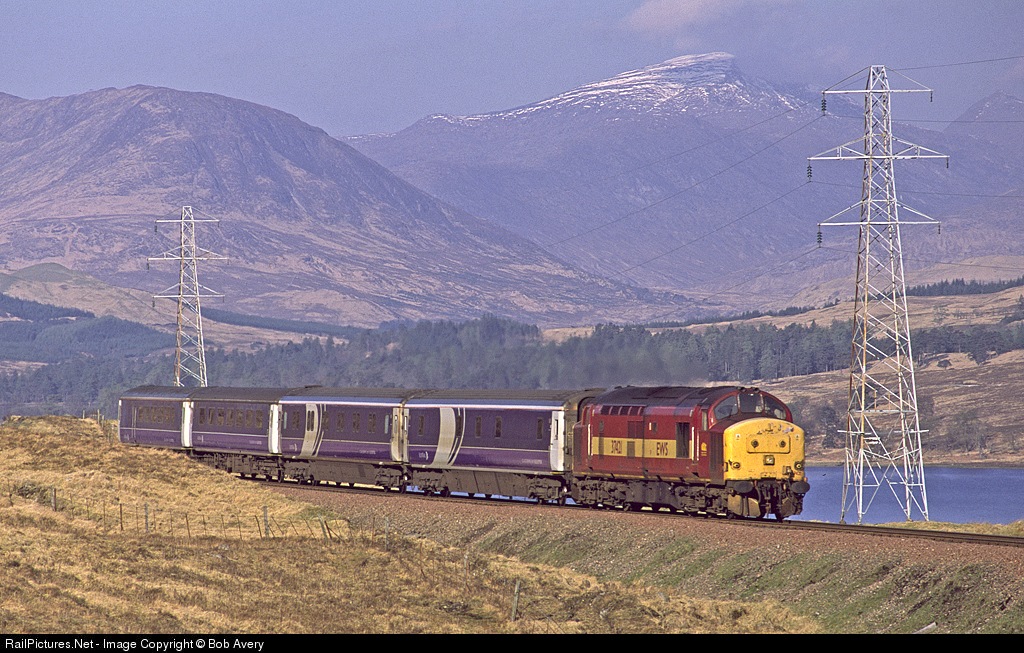 | Passengers on the overnight London-Fort William sleeping car service must think London is on another planet as they wake up to the stunning West Highland line scenery. And for once it's not raining! The 37s are, sadly, now replaced by class 67s. |
