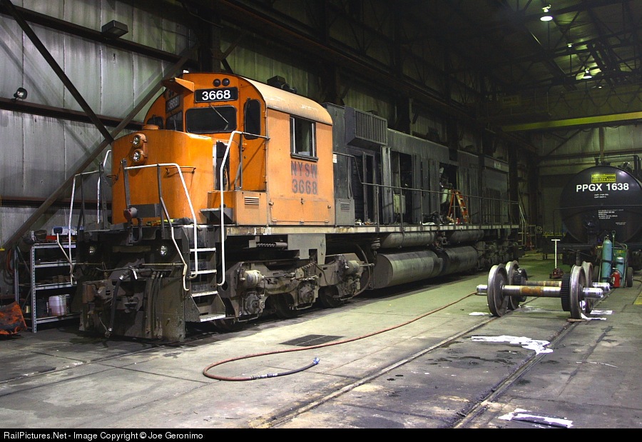 NYS&W #3668 is under repair in the Utica shops. Unfortunately the railroad hopes to bring this unit back into service. Alcos are great to take pictures of but are not great to operate.