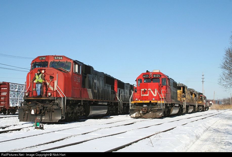 CN 6125 sits in Markham, awaiting its next call to duty, while CN 5798 passes by.