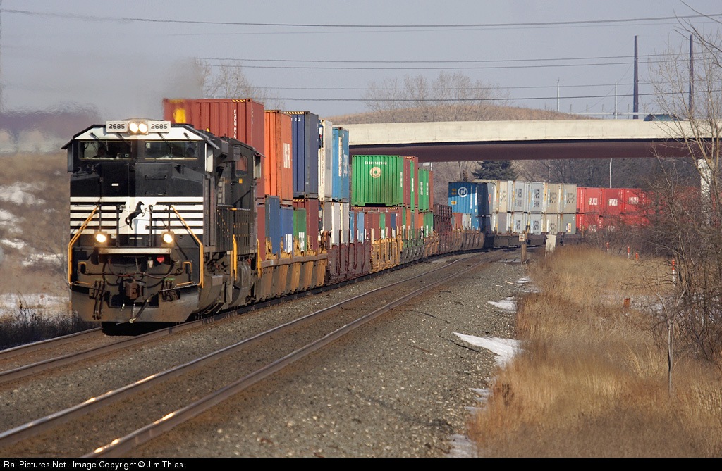 NS 2685 leads a colorful string of intermodal containers through Odgen Dunes, Indiana.