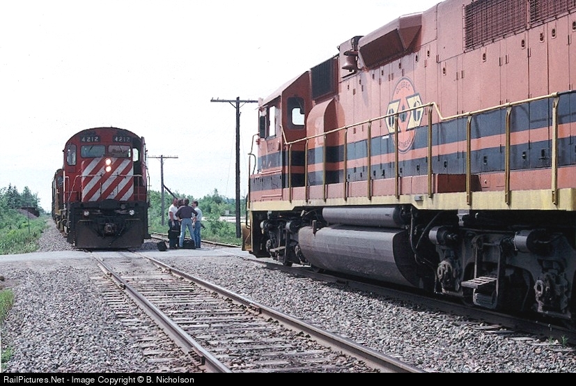 | QG trains exchange trains & crews at Maralan, Quebec, near Lachute, Que. The ex-CP C424 is no longer active on teh QG. |