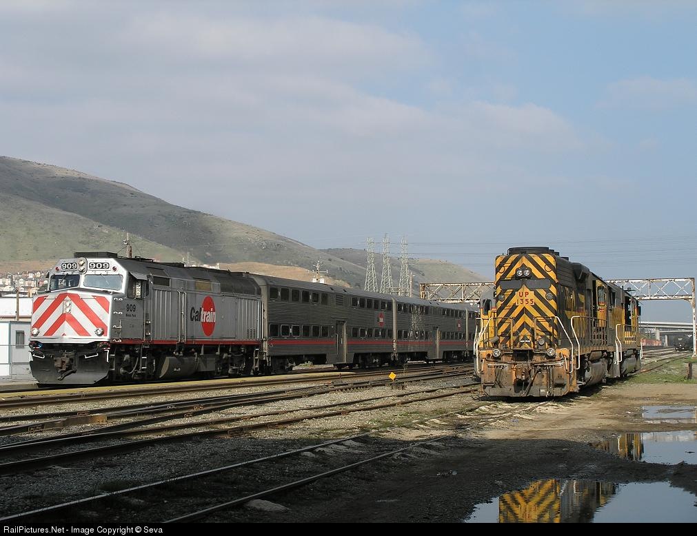 A southbound Caltrain commuter passes UP local power sets waiting at the South San Francisco yard