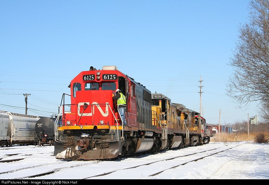 | CN SD40-2 6125, a UP C40-8, a UP C41-8W and a GTW GP38-2 idle in Markham Yard. |