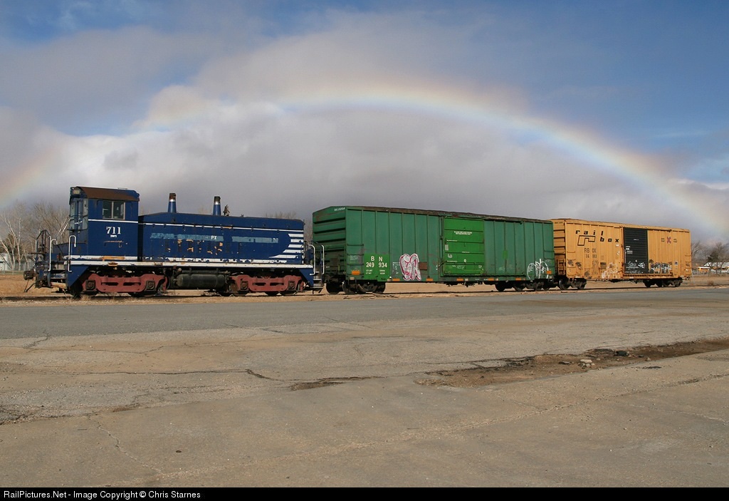 RMPX 711 and two boxcars sit on the Progress Rail lead in the industrial park at Mojave, framed almost perfectly by a rainbow in the western sky.