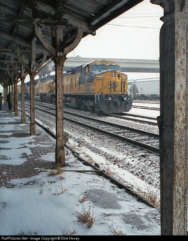 | UP train departs Marshalltown through the snow; seen through the canopy of the, now demolished, Marshalltown depot. |