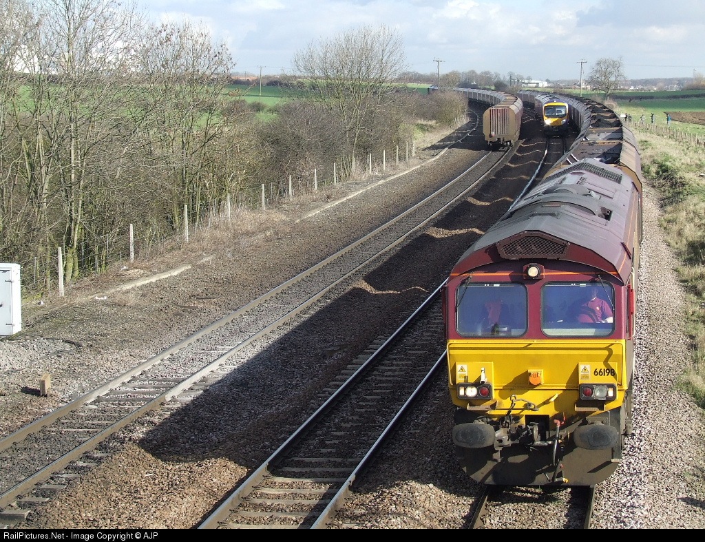 | 66198 passes as a class 185 on the fast is about to pass, and another class 66 on coal train en-route to Immigham. |