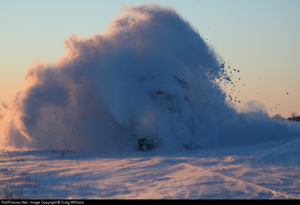 Winter weather is causing many headaches west of Waterloo for the CN. Eastbound extra local from Sioux City to Ft Dodge hits drifts at sunset. This is BNSF power is off an Alden grain empty.