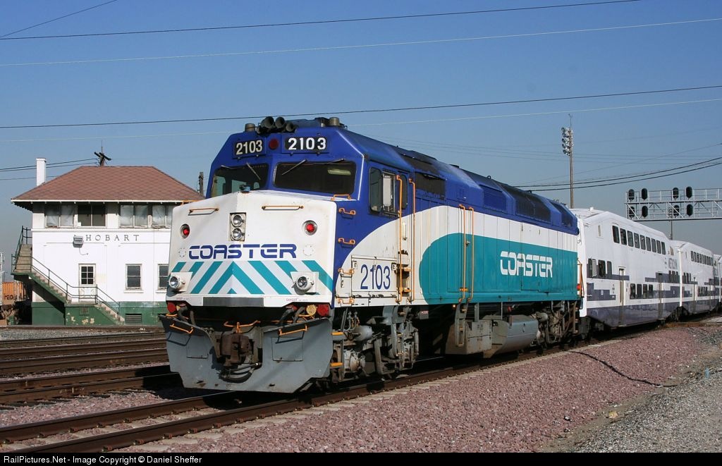 | This train is heading southbound in the push mode. The San Diego Coaster is a little out of place as the location is in front of historic Hobart interlocking tower that once protected the very busy ATSF & UP crossing at this location. |