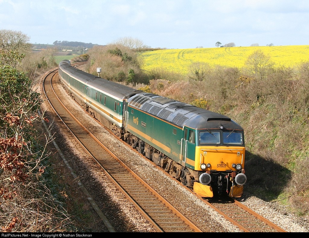 With the 'Night Riviera' sleeper set in tow 57605 decends the bank to St.Germans standing in for a HST with the 10:32 Penzance to Plymouth.
