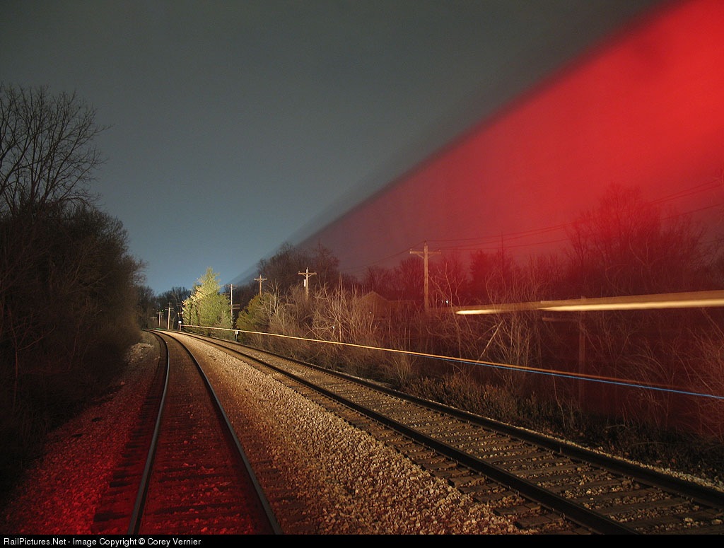 The marker lights on the rear of southbound CSX W007-09 illuminate a passing northbound NS roadrailer train in the early morning hours.