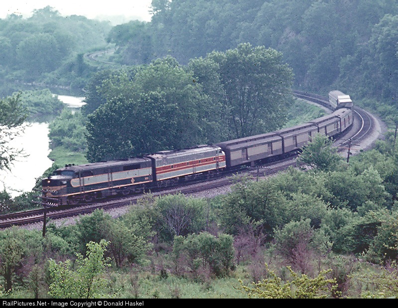 Old and new color schemes lead the Eastbound Fast Mail. ALCO leads EMD E 8 in a valley near Susquehanna, the location of the old Delaware Lackawanna and Western Shops.