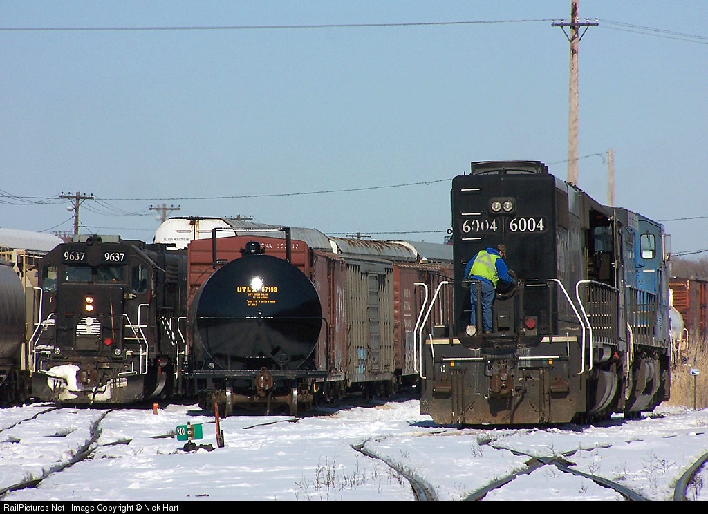 Illinois Central SD40 6004 heads into Homewood Yard as Illinois Central GP38-2's 9637 and 9617 head out of the yard.