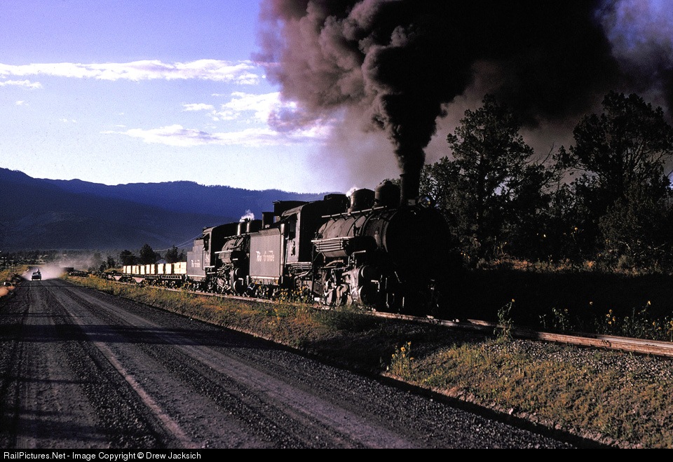 Mechanical problems with #492 had caused a significant delay and with, the last rays of sunlight, Rio Grand K37 #492 and K36 #484 are stepping along on the newest narrow gauge track on the system. This portion was onlyabout 5 years old, having been built by the Feds to relocate the line from the new Navajo Dam between Durango and Chama.. A 1965 version of a foamer kicks up dust in the distance.