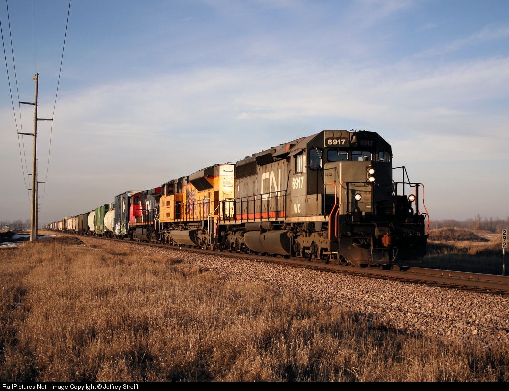 | A healthy 120 car manifest from the CN at Superior, WI heads south on the ex-Rock Island Spine Line for Des Moines, IA. |