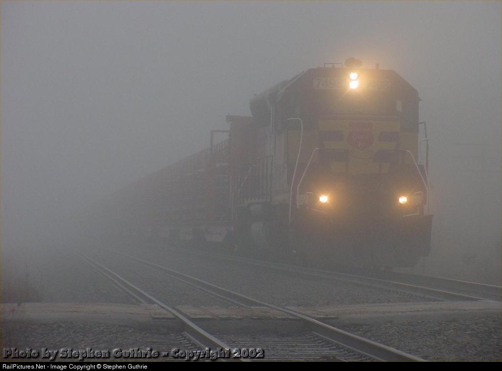 A load rail train blast throught the fog at Junction City, WI headed for Chicago.