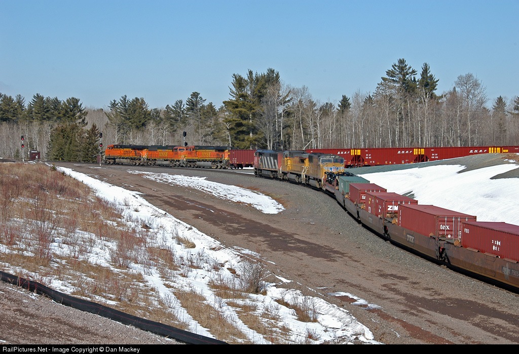 An empty all-rail headed for the iron range from BNSF's Superior yard while CN train 119 waits to get into Pokegama Yard