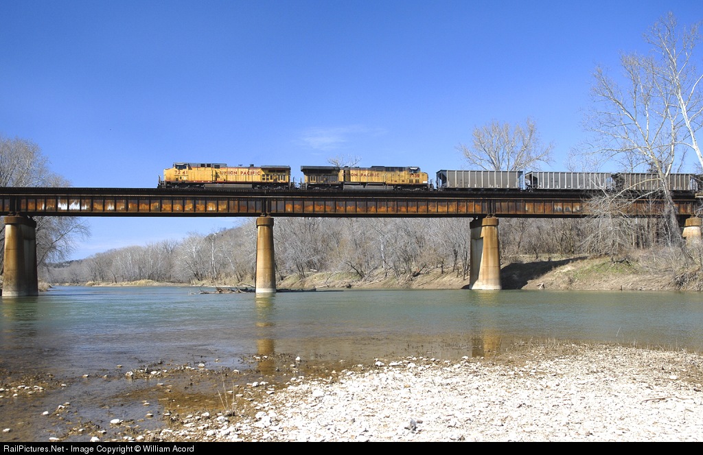 Union Pacific #7241 leading empty coal drag westward across the beautiful Meramec River on a crisp, balmy mid March afternoon--Nikon D200