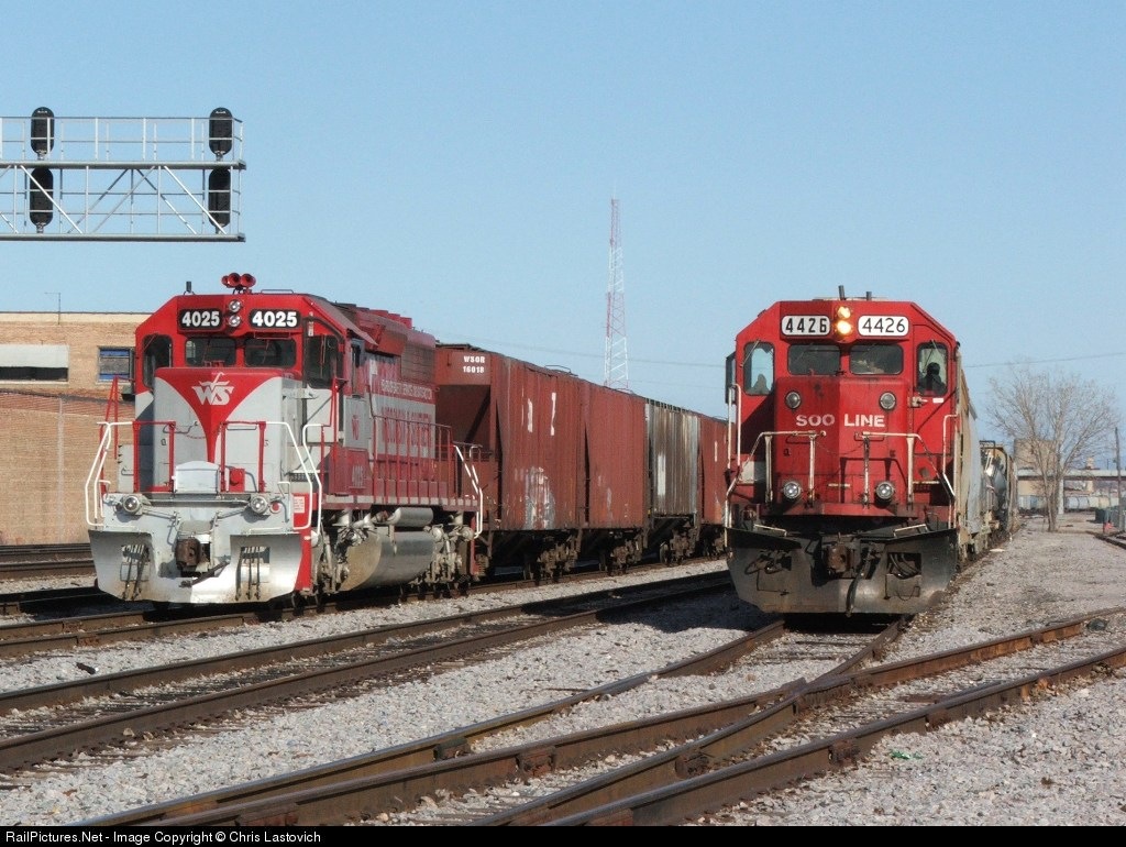 A CP local with SOO GP38-2 4426 idles along side what appears to be an extra WSOR grain train with the 25th anniversary unit in charge.