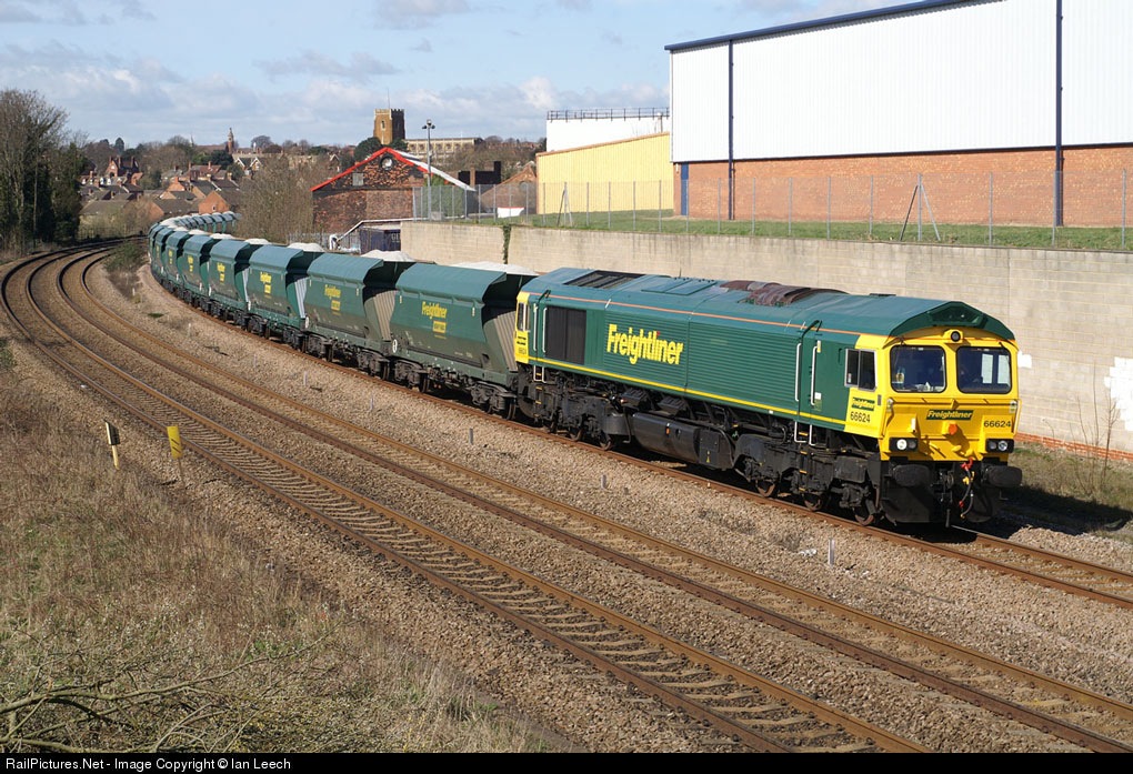 | Just a couple of weeks old, 66624 still looks spotless as it heads 6M17 Croft to Neasden past the old British Leyland works in Wellingborough. |