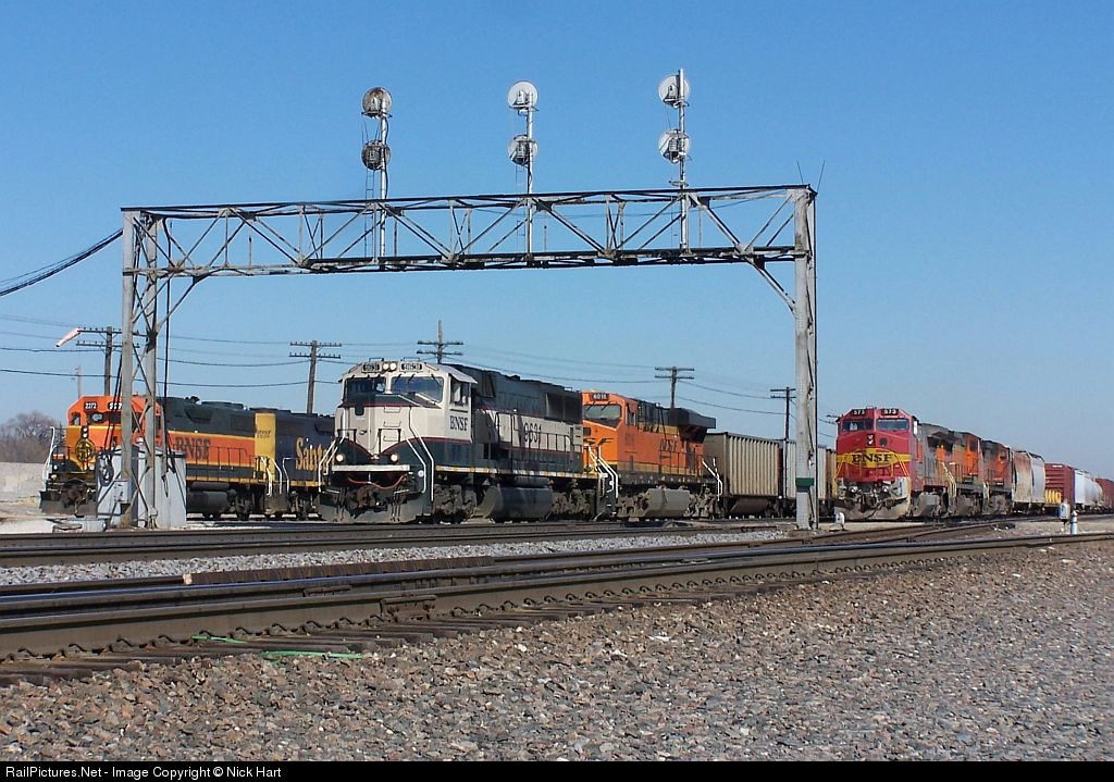 | BNSF Heritage 1 GP38 2272 and Santa Fe Bluebonnet GP39-2 2839 wait to depart the yard with a CN interchange train. BNSF Warbonnet B40-8W 573 is off to the right awaiting a new crew. Right in the middle of the action is BN Executive SD70MAC 9631, missing its logo. |