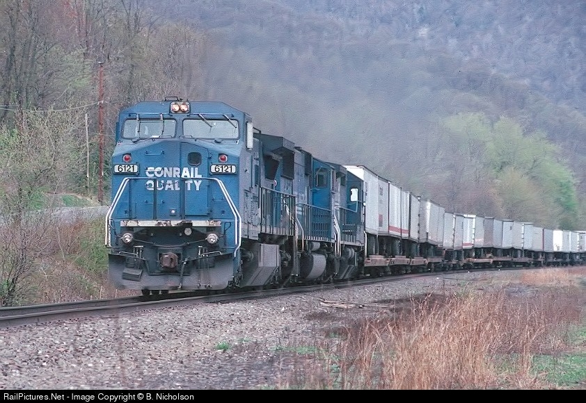 | Two eastbound Conrail trains were charging at me side by side at Rockville ,PA in 1997. I decided to shoot 6121 first as it was a more dramatic shot. |