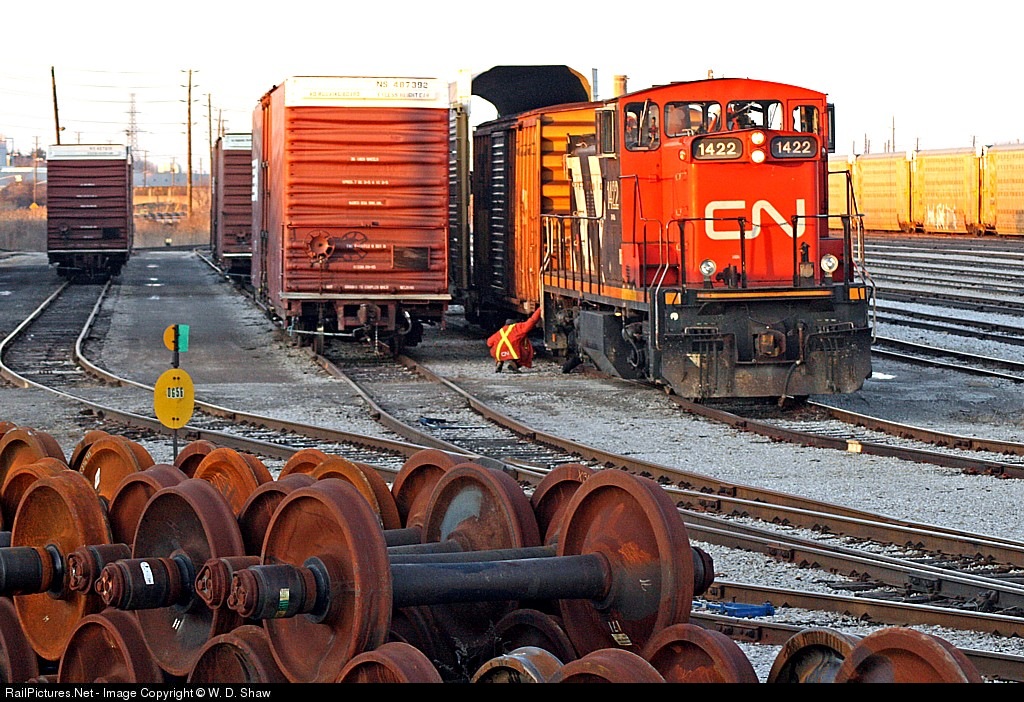 | A member of the crew working Oakville Yard with CN 1422 has noticed something odd on the rear truck and bends for a closer look. After conferring with other crewmen, work carries on until sundown. 1422 was back at work the next day so it couldn't have been anything too serious. |