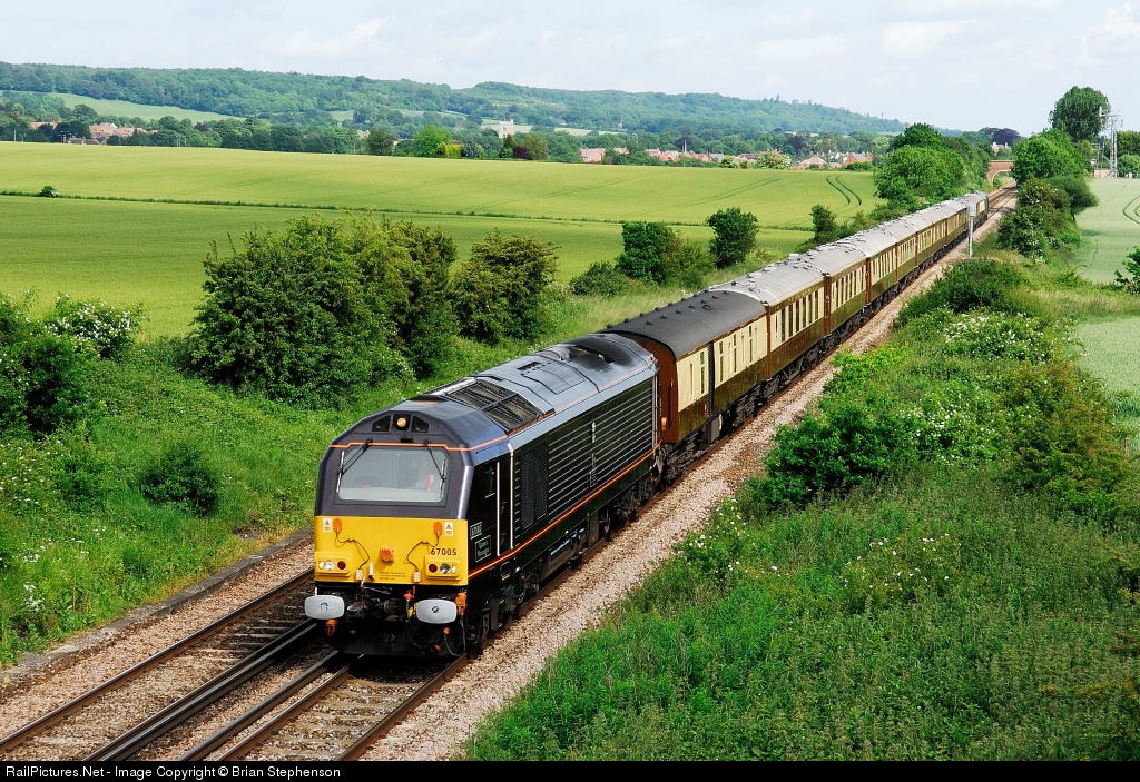 | EWS Bo-Bo diesel-electric No 67 005 Queens Messenger, one of the two Royal Engines, has just passed Charing with the Venice Simplon Orient Express British Pullman train returning to London from Folkestone Harbour. |