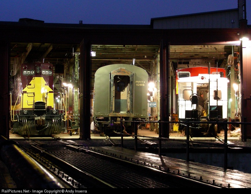 | Even after hours the place is buzzing with activity with 559, coach 1096, and Soo caboose 31 in the shops. As the rains moved in it was still in the 60's on this very warm March night. |