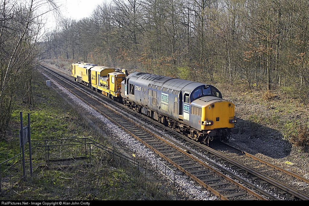 | On a fine spring day this DRS 37 has worked down from Doncaster to Ashford Kent to delivery a stoneblower (maintenance of way machine) to the repair centre at Ashford. If you listen carefully you can hear the pheasants calling in the woods! |