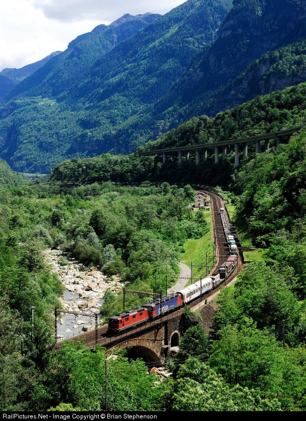 | An SBB Re 4/4 + Re 6/6 combination head north with a lightly loaded Hupac piggy-back train at the foot of the double spiral between Giornico (altitude 405m) and Lavorgo (615m) on the climb to the Gotthard tunnel. |
