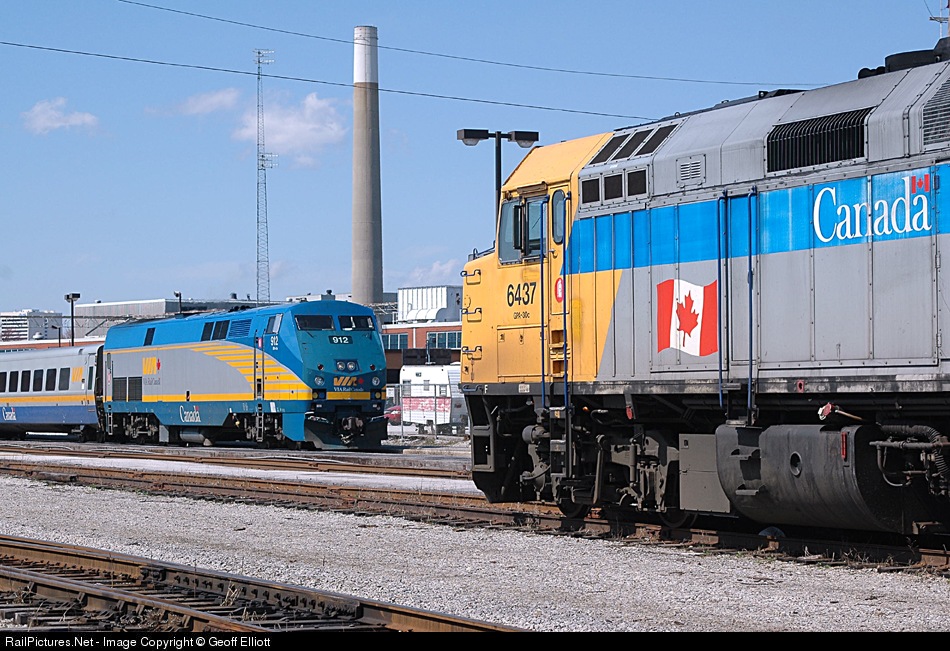 | VIA 6437 with train #677 meets VIA 912 in Windsor. 6437 was leading the 10 car Wrestlemania extra from Toronto to Windsor with hundreds of fans heading over to Detroit for Wrestlemania 23. 912 was waiting for 677 to clear before departing with train #74 bound for Toronto. |