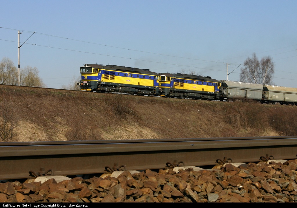 | The 752.604, 603 at the head of OKD Doprava freight train on the junction "Polanecka spojka" from Ostrava Svinov to Ostrava Vitkovice. |