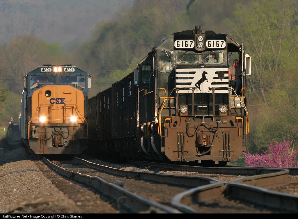 | Springtime in the mountains....longer days, everything turning green and everything under the sun blooming. Throw in with that a couple of clean EMDs and a 70 degree evening and you have a great time to be out trackside. NS T74 sits in the siding at Watkins as a set of CSX pusher engines prepares to head back west on the mainline. |