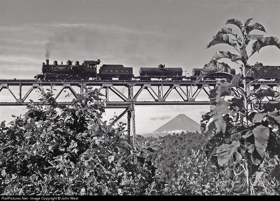 The morning passenger train to Puerto Barrios (running as a mixto) crosses the Las Vacas viaduct leaving Guatemala City. One of the many volcanos surrounding Guatemala City is framed by the bridge. And there is nothing dormant about it, at night there is a glow from the top. Fegua is the former Guatemala Division of the International Railways of Central America.